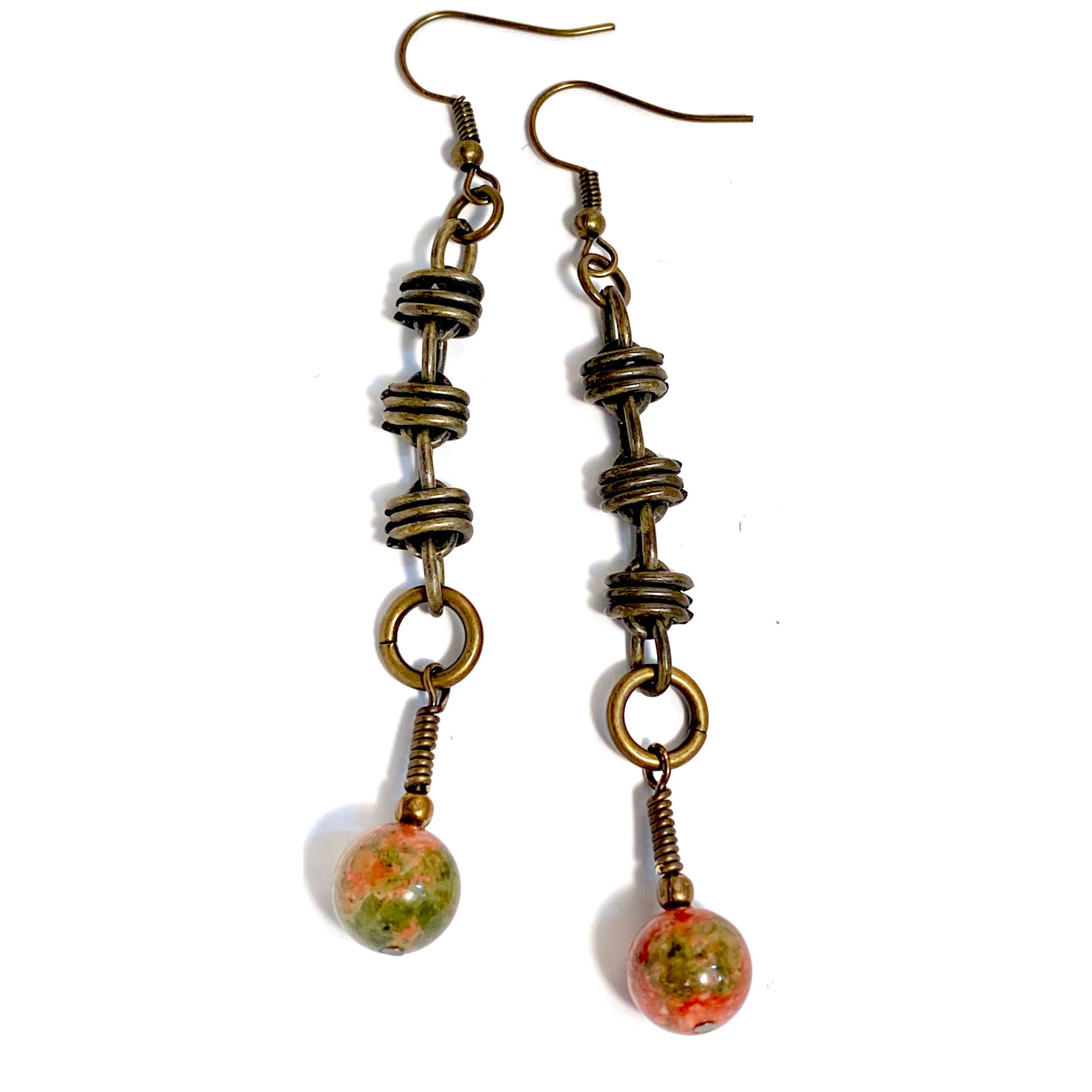 3 inches long including the brass ear wires, 6mm Unakite round beads.