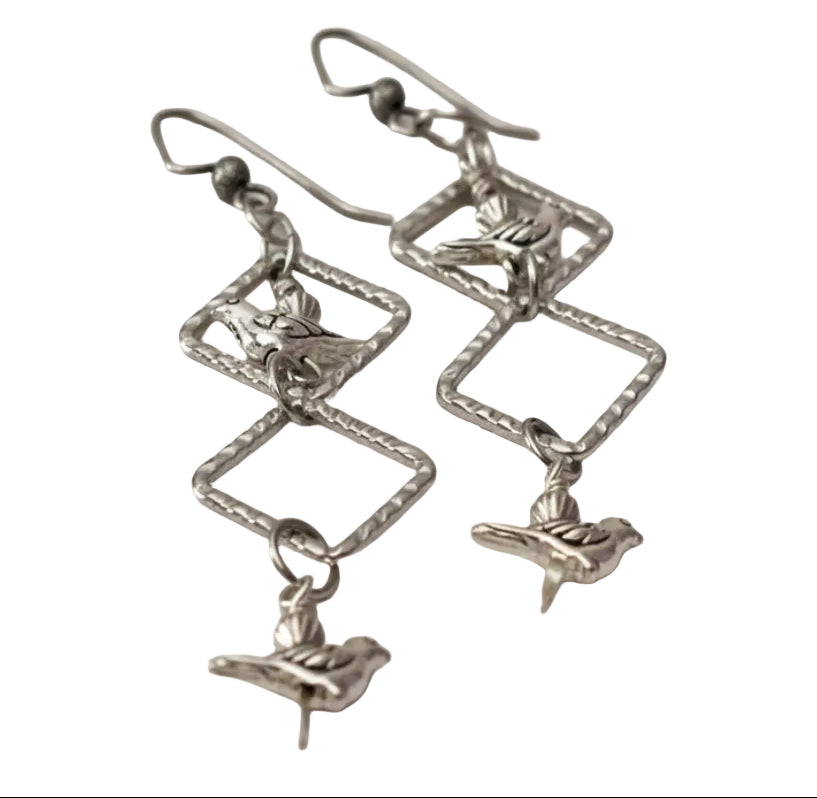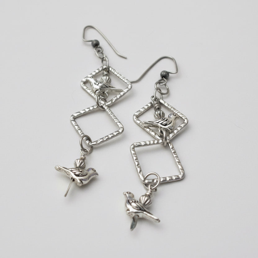 Delicate silver bird charms rest atop wire-wrapped, silver-plated frames featuring a subtle hammered texture, creating dimensional visual interest. These versatile earrings complement diverse wardrobes with their refined aesthetic. Measuring 3 1/4 inches in length, they feature brushed silver-plated ear wires accented with a gunmetal bead for balanced proportion and understated elegance.