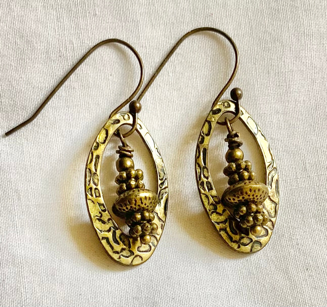 Open center, textured brass hoops encircle dotted beads that dangle freely in the center. The center bead is a rustic bohemian vibe. The ear wires are antique brass hooks and measures 2 inches long including the ear wires.